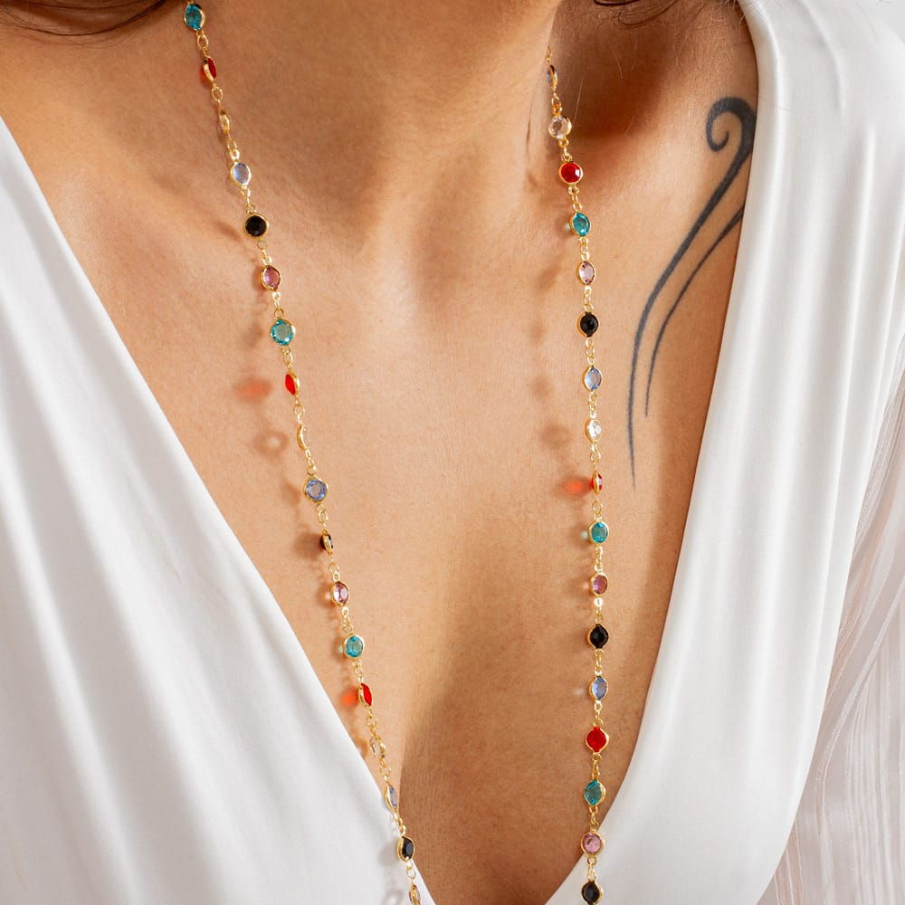 Composto por zircônias em uma variedade de cores vibrantes, incluindo vermelho, azul tiffany, rosa, preto, azul royal e cristal, o Colar Longo Colorido apresenta um banho de ouro que harmoniza perfeitamente essas tonalidades. Com um peso de 13 gramas, este colar é não apenas deslumbrante, mas também extremamente confortável de usar.